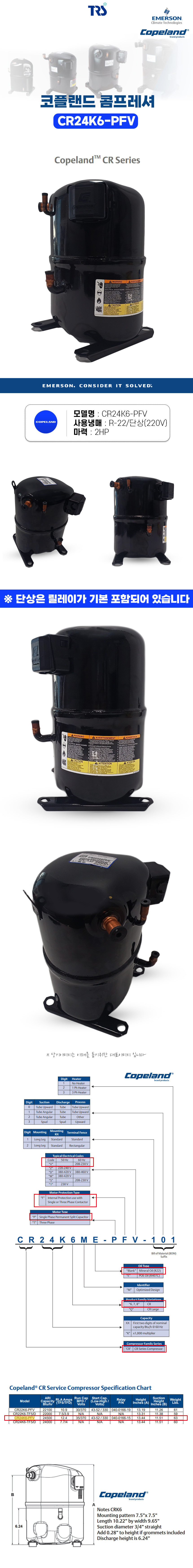 코플랜드 콤프레셔 CR24K6-PFV 2마력 단상
