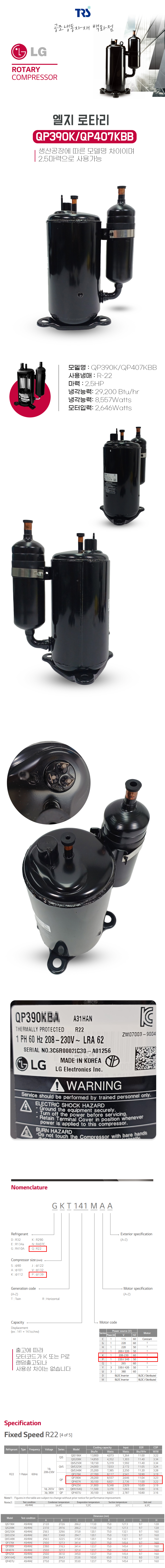 LG로타리 콤프 QP390K / QP407KBB 2.5마력 단상
