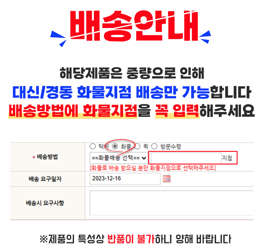 - 화물배송의 경우, 주문 시 받아보실 화물 지점을 정확하게 기재해주세요.