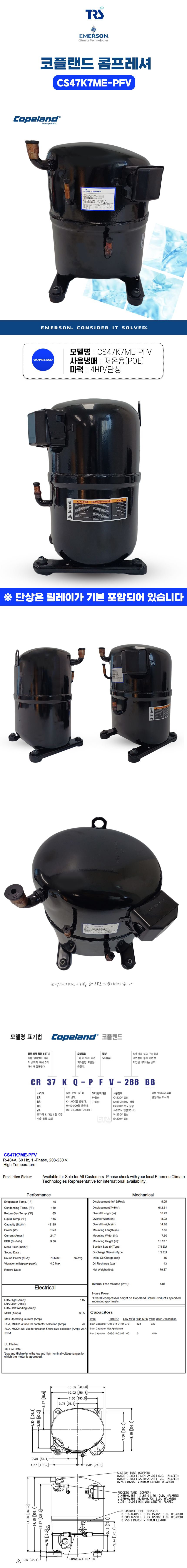 코플랜드 밀폐 왕복동 콤프레셔 CS47K7ME-PFV 4HP 단상