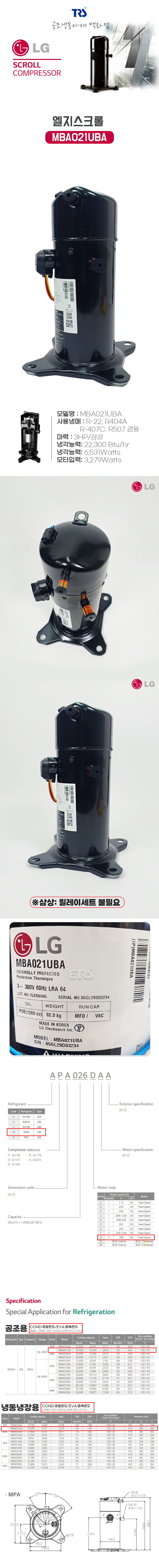 LG스크롤 콤프 MBA021UBA 3마력 삼상