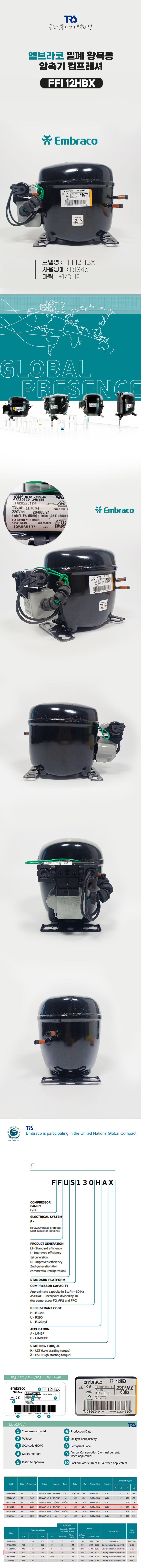 밀폐 왕복동 엠브라코 1/3마력 FFI 12HBX